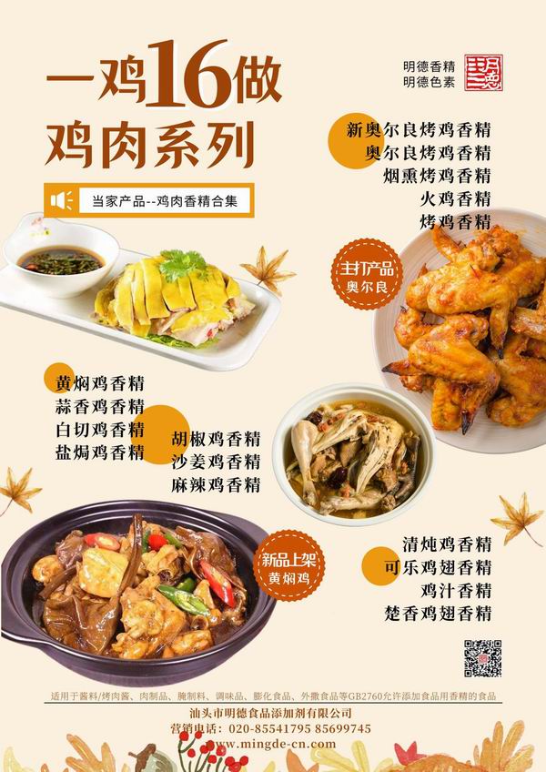 在雞肉香精領(lǐng)域我們潛心專研,結(jié)合市場(chǎng)潮流,消費(fèi)者喜好,汕頭市明德食品添加劑有限公司現(xiàn)有以下16種雞肉相關(guān)風(fēng)味的香精,供您選擇。并持續(xù)努力研發(fā)更多符合市場(chǎng)需求的風(fēng)味。