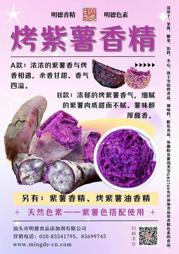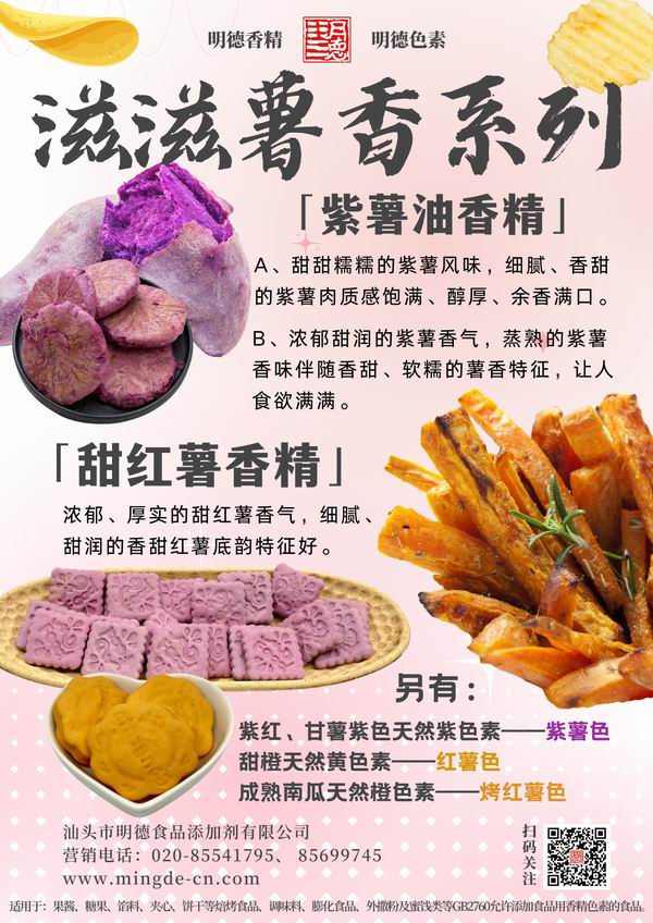 在薯味香精領(lǐng)域我們數(shù)十年潛心專研,迎合市場需求,滿足消費者喜好,汕頭市明德食品添加劑有限公司,推出了多種風(fēng)味的薯香風(fēng)味香精,如:紫薯香精、紅薯香精、烤紫薯香精、烤紅薯香精、甜紅薯香精等。